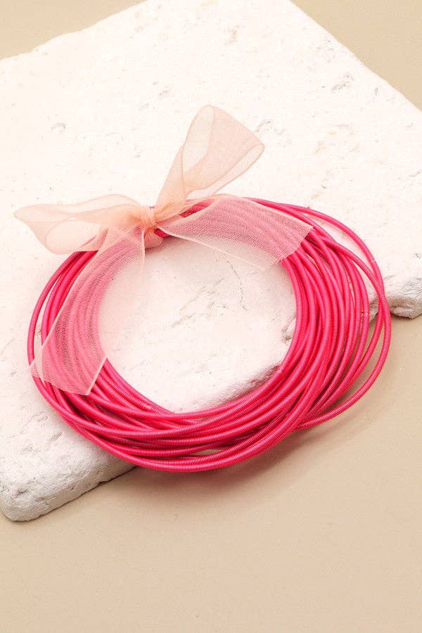 Stainless steel stretchy guitar string bracelets. Each set features 20 stainless steel bracelets.
